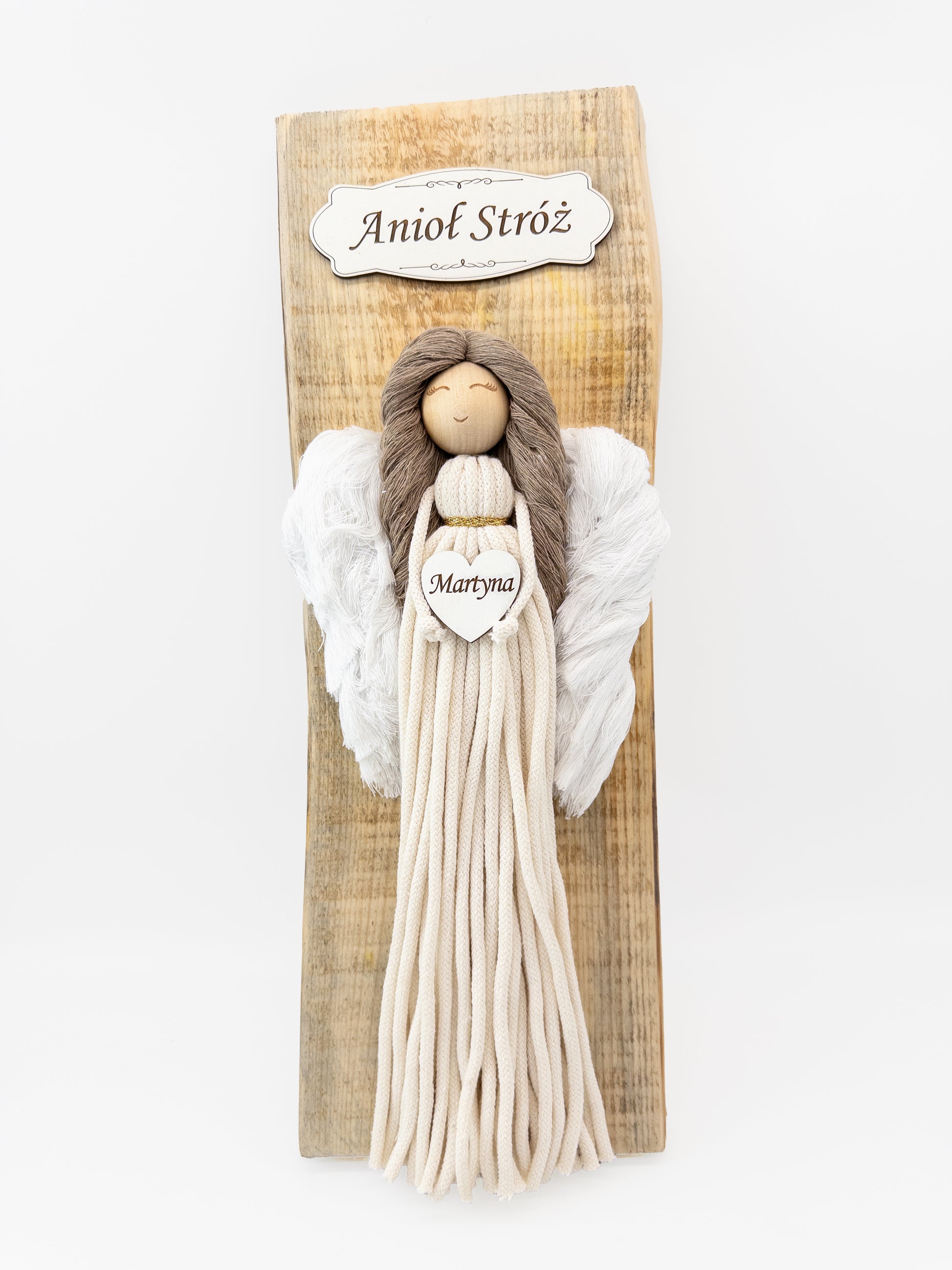 Makramowy Anioł Stróż na desce – rękodzieło z personalizacją