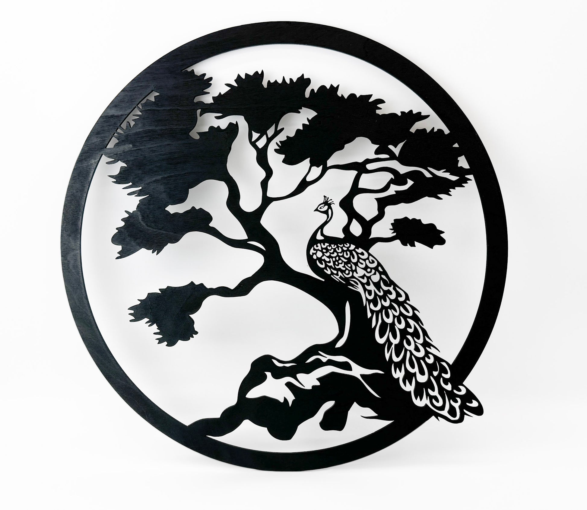 Drewniana baza pod mech chrobotek – Pawi motyw z drzewem bonsai
