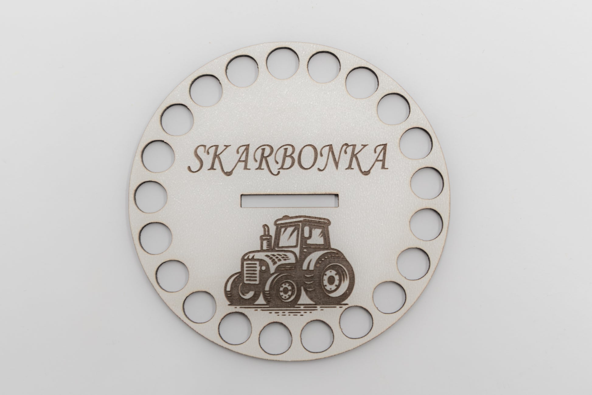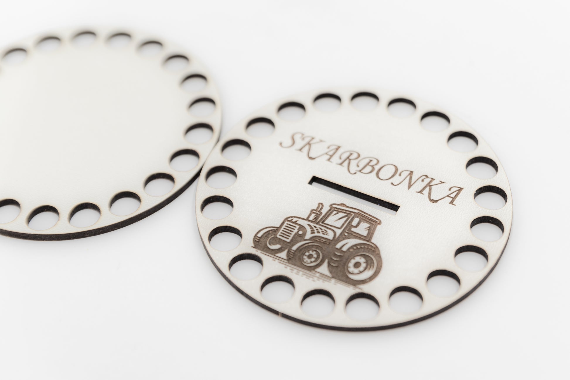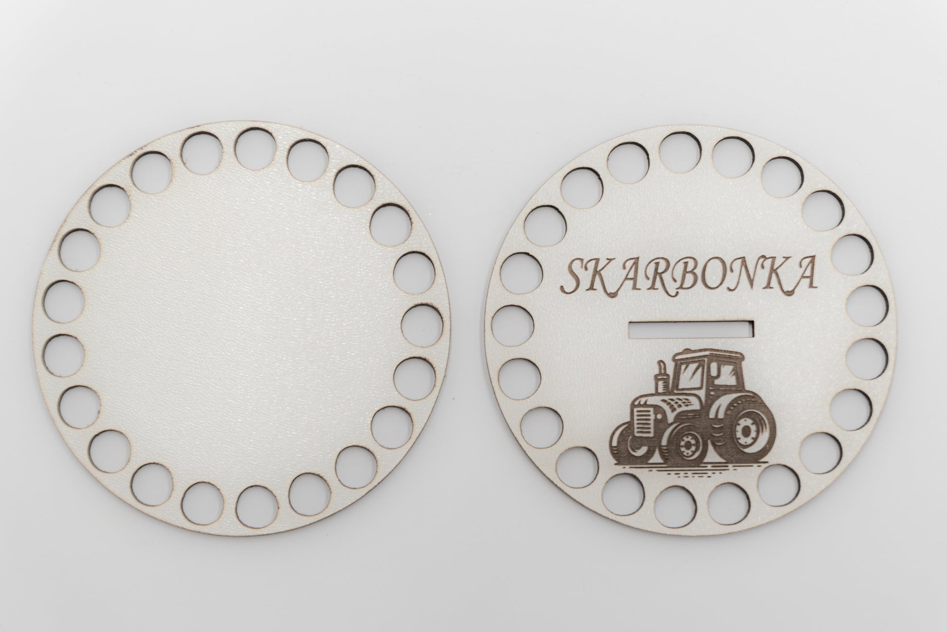 Stwórz oryginalną, własnoręcznie wykonaną skarbonkę handmade z bazą, która ucieszy każdego małego fana traktorów! Ten zestaw dwóch elementów z jednostronnie białej płyty HDF zawiera okrągłe bazy z otworami i ozdobnym grawerem traktorka oraz napisem SKARBONKA. To idealna baza do szydełkowania koszyczka-skarbonki.