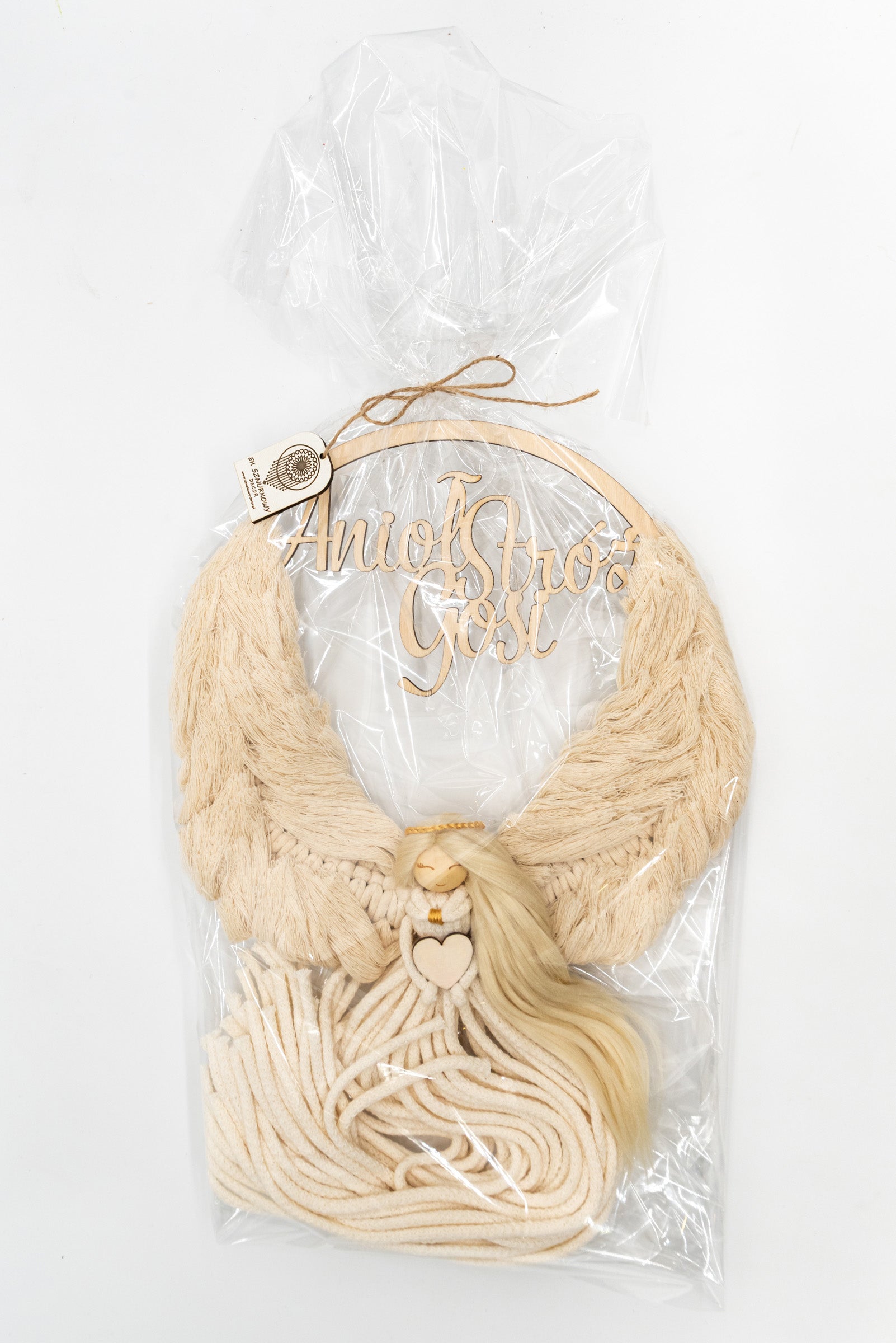 Makramowy Anioł Stróż na drewnianej obręczy z napisem to wyjątkowa dekoracja ścienna i doskonały pomysł na prezent, stworzona z miłością do detalu i natury. Delikatny anioł ze sznurka, ręcznie wykonany w technice makramy, symbolizuje opiekę, spokój i dobro. Obręcz wykonana jest z wysokiej jakości sklejki brzozowej o grubości 4 mm, a całość utrzymana jest w stylu boho, który idealnie wpisuje się w naturalne i przytulne wnętrza.