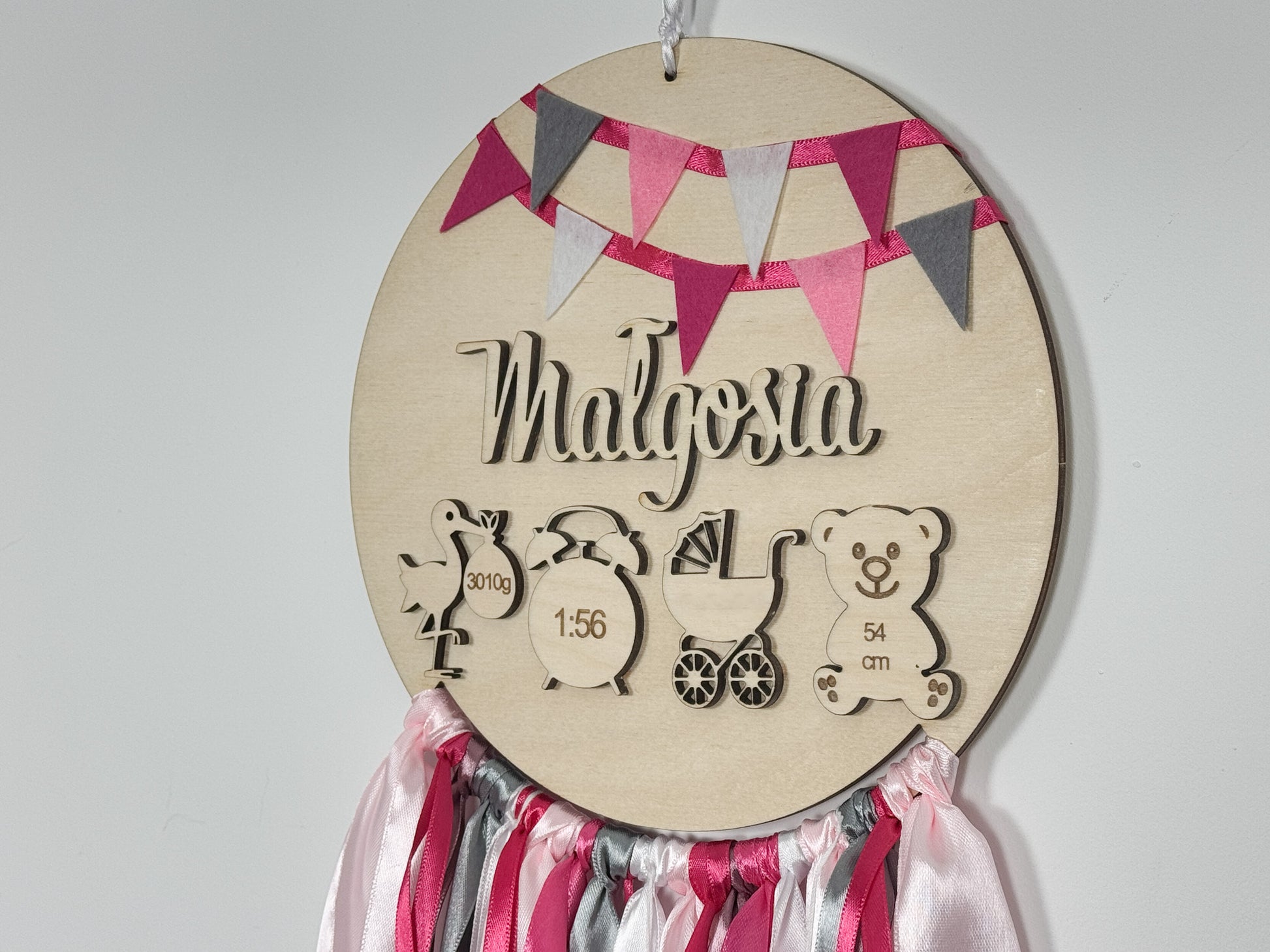 🔸 Personalizacja – na delikatnych, drewnianych elementach umieszczamy najważniejsze informacje o maluszku: imię, data urodzenia, godzina, waga i wzrost.